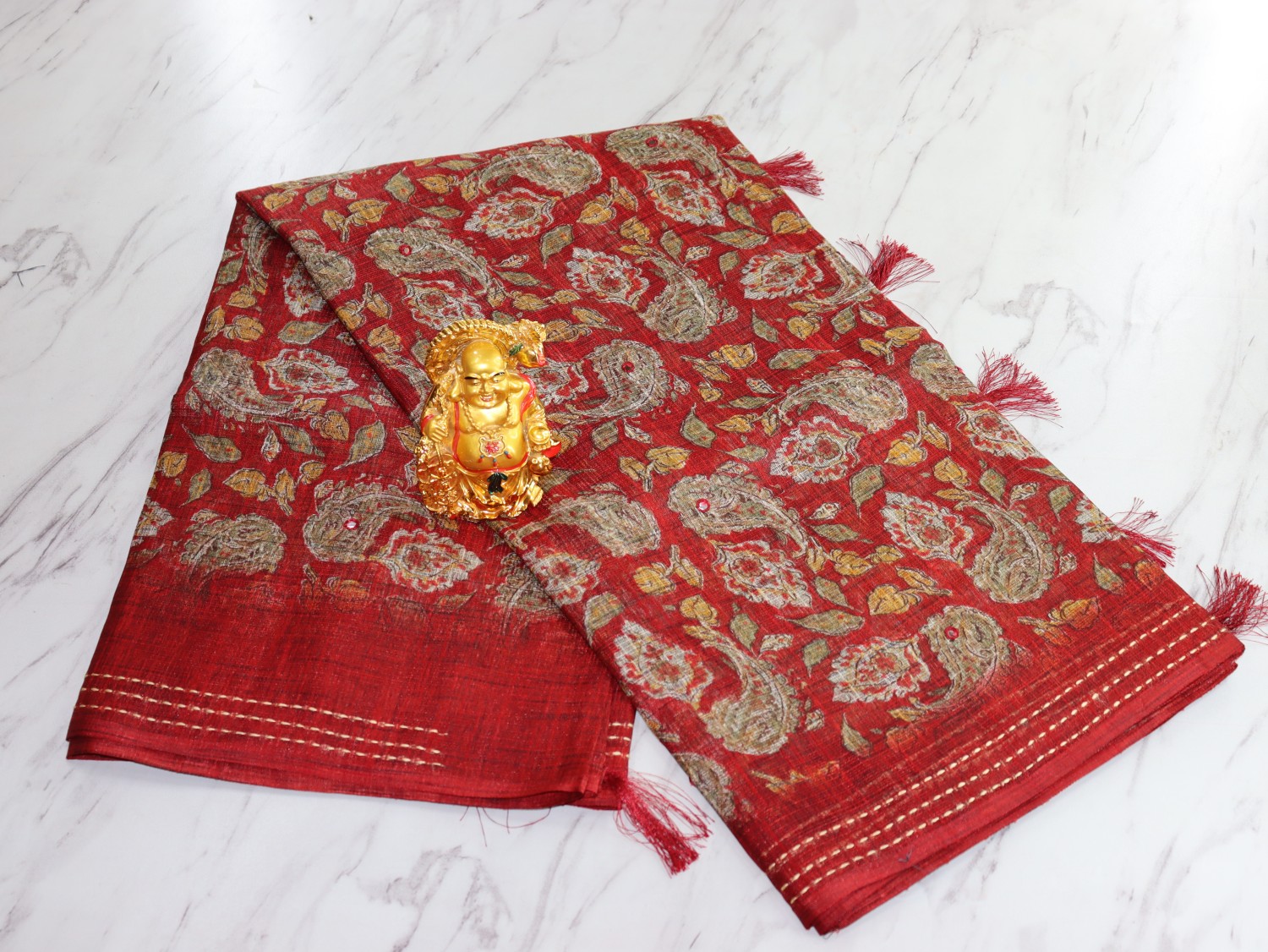 Step into festive radiance with the Rosalia Jacquard Linen Saree. Its intricate paisley floral motifs and rich zari weaving reflect timeless craftsmanship. Lightweight yet regal, this saree brings out the grandeur of ethnic beauty with modern ease.